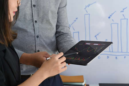 Business people analyzing graph of stock market with computer tablet.