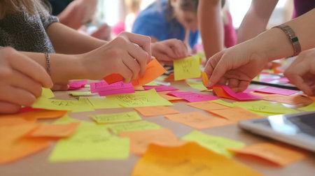 A dynamic scene of individuals participating in a brainstorming session, using colorful sticky notes to share ideas and foster collaboration in a vibrant office setting.