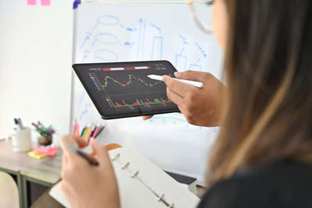 An investment expert points a pen at a tablet monitor to analyze the stock market to teach you how to make a profit.