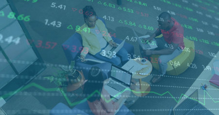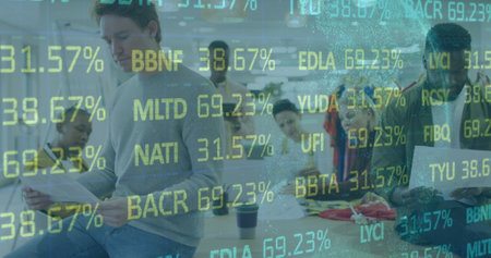 Image of financial data processing over business people in office. Global business, computing, connections and data processing concept digitally generated image.