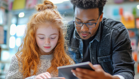 Teacher helping a young student to use a digital tablet while standing in a library