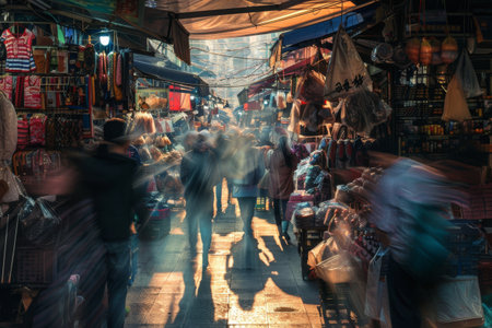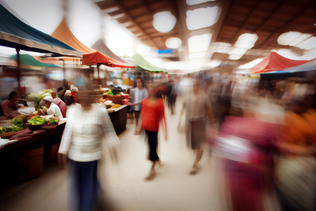 Blurred images of shoppers bargaining with vendors for the freshest fruits and vegetables