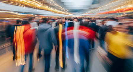 An abstract photograph captures the frantic energy of a busy city street with a large crowd of anonymous people rendered in motion blur. The long exposure and intentional camera movement create vibrant streaks of light and color, conveying the constant movement and fast pace of urban life.