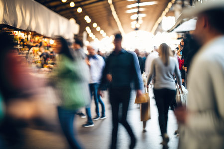 Blurred, Bustling Indoor Market Hall, Shoppers Browsing Diverse Stalls, Daytime Commerce
