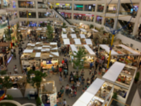 Blurred Crowded Shopping Mall, Festive Decorations, and Bright Lights Create a Busy Atmosphere