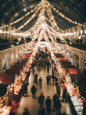 Crowds move through a vibrant holiday market adorned with twinkling lights, showcasing booths filled with festive goods and decorations.