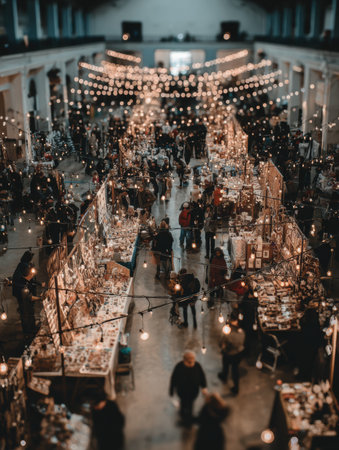 Visitors explore various artisan stalls at a lively craft fair, surrounded by warm lights and the buzz of excitement in a spacious hall during the evening.