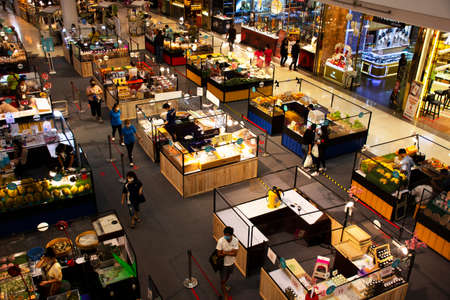 NONTHABURI, THAILAND - MAY 21 : Thai entrepreneur people sale products food and drinks with social distancing while virus outbreak at Department store and mall on May 21, 2020 in Nonthaburi, Thailand