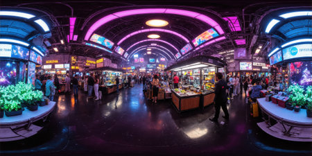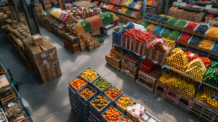 A bustling market showcases an array of colorful fruits, vegetables, and various food items. Shoppers explore the aisles, creating a sense of activity and community. The scene is illuminated by natural and artificial lighting, highlighting the textures and variety of the goods. This image may be suitable for illustrating food retail or culinary topics.