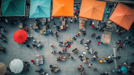 A captivating aerial view showcases a bustling outdoor market filled with colorful stalls offering a wide variety of fresh fruits and vegetables. The scene captures the lively atmosphere of daily commerce.