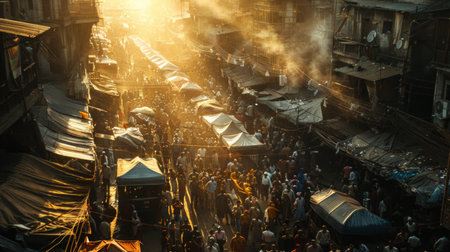 Busy crowded market street during golden hour, capturing the hustle and bustle of a lively marketplace