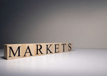 Markets text made with wooden blocks. It is illuminated by spotlight. Close up.