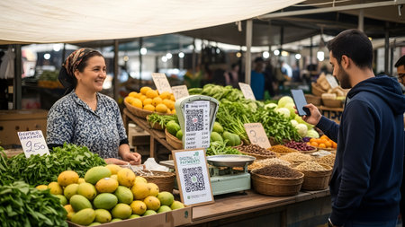 Woman making contactless payment with credit card on farmers market
