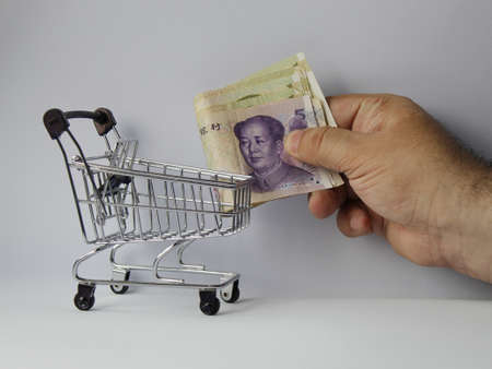 hand of a man putting chinese banknotes in a shopping cart