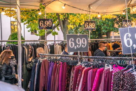 ROVIGO, ITALY 26 OCTOBER 2021: Stand of clothes at street market detail