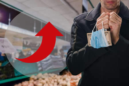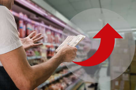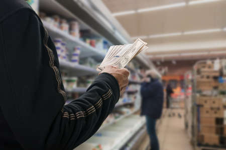man holds dollars in the supermarket. purchase concept