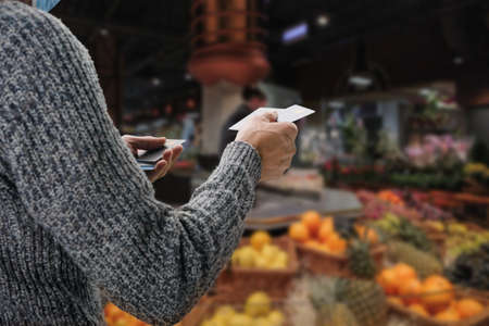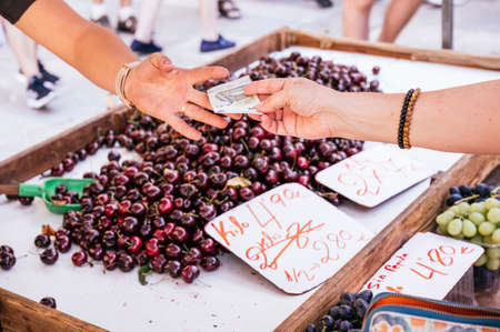 Unrecognizable woman paying cash with a 5 euro bill at a local street market
