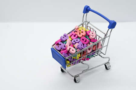 Multicolored wooden numbers in a metal supermarket trolley on a white background. Concept: back to school, math, arithmetic, learning to count. Space for text