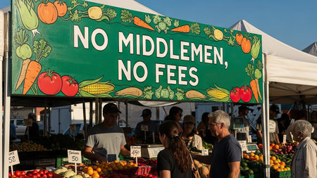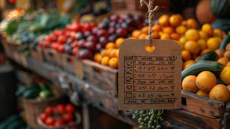 A vibrant outdoor market scene features a stall displaying fresh produce and signage. The composition uses natural lighting, showcasing colorful vegetables like tomatoes, corn, and carrots. The overall style suggests a farmers' market, potentially suitable for editorial content related to food, agriculture, or local commerce.