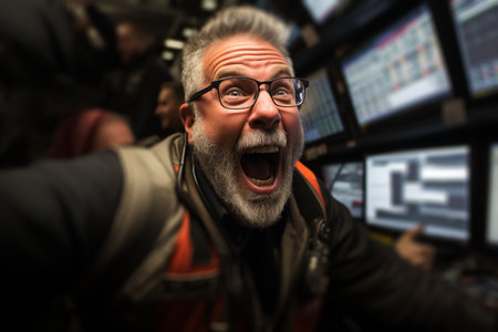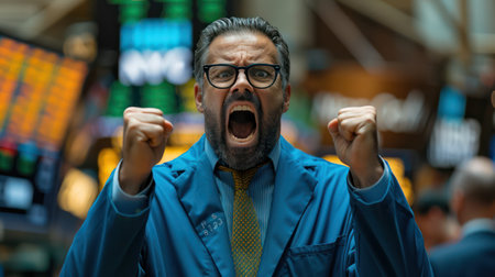 Portrait of a trader on the stock exchange, rejoicing at the rapid growth of shares. Concept of bullish trend in markets. To the moon