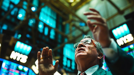 Traders engage in active discussions on the stock exchange floor during a bustling trading session
