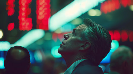 A businessman looks upward on the trading floor, analyzing market trends in a moment of reflection during economic uncertainty. The atmosphere suggests tension and focus.