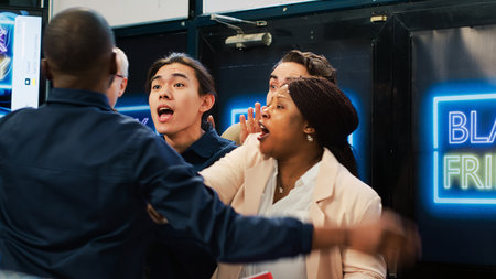 Mad diverse shoppers at store entrance going crazy for Black Friday promotions and deals, pushing through red tape. African american security agent managing crowd control during sales season.