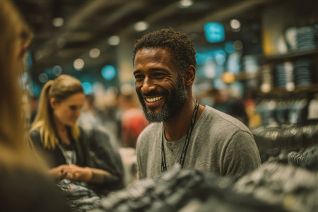 Smiling african american man is engaging with customers in a retail store, surrounded by clothing racks and a vibrant shopping atmosphere.