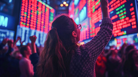 A woman raising her hand in celebration while watching stock market data on a large screen at a busy stock exchange.