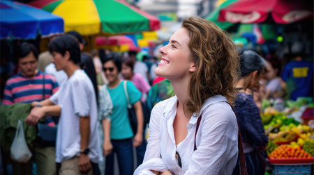 Smiling woman enjoying vibrant outdoor market with colorful umbrellas