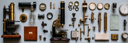 Various antique scientific instruments arranged neatly, showing intricate designs and craftsmanship, reflecting a rich history of science and exploration.