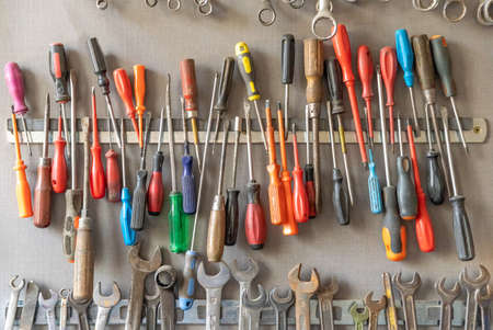 large colorful set of old wrenches and screwdriver in the DIY workshop