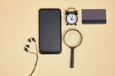Online shopping concept. Smartphone with credit card headphones, magnifier, alarm clock on beige background