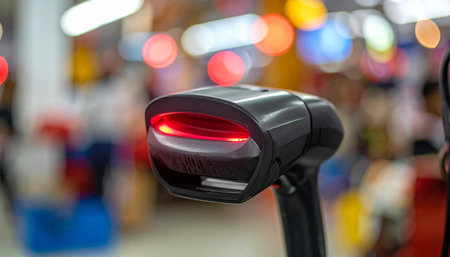 A black handheld barcode scanner with a bright red laser light is in focus, with a blurred retail store background.