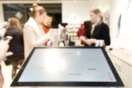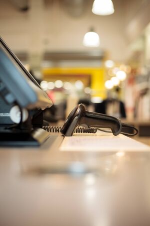 Scanner near by the cash register or touchscreen pos at huge shopping center, finance concept