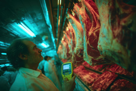 Male butcher examines meat cuts in cold storage, utilizing a temperature gauge to ensure proper conditions, highlighting quality control in food processing