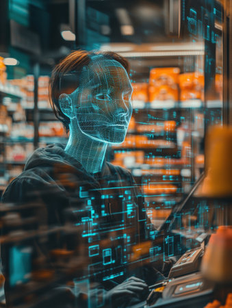 A cashier operates an advanced checkout system in a bustling supermarket, utilizing AI to streamline transactions for shoppers.