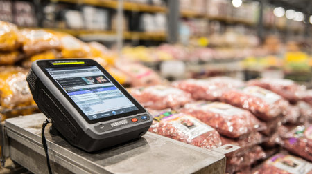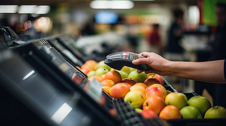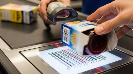 A close-up view features hands scanning a packaged food item at a checkout counter. The scene showcases modern retail technology with a barcode reader and a bright screen. The composition has an overhead perspective, with natural lighting illuminating the transaction. Suitable for illustrating retail operations and commerce.