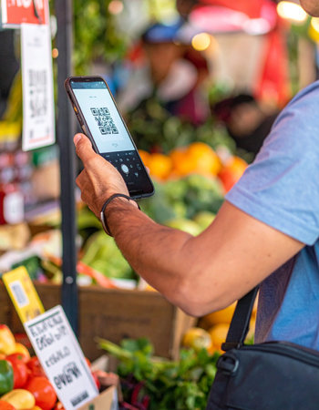 A customer uses their smartphone to make a quick and easy contactless payment by scanning a QR code at a vibrant outdoor farmers market.