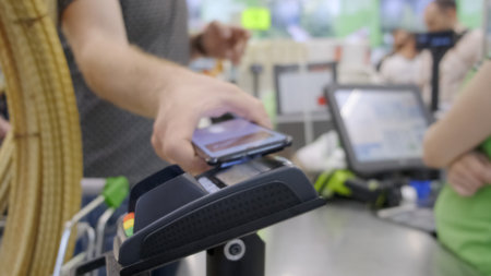 NFC contactless payment with electronic credit card in smartphone and via POS terminal. Focus on the customer's hand holding mobile phone and making contactless payment. Wireless technology concept