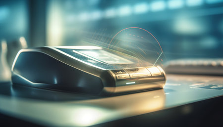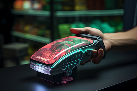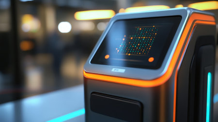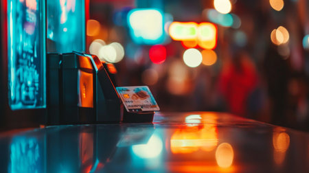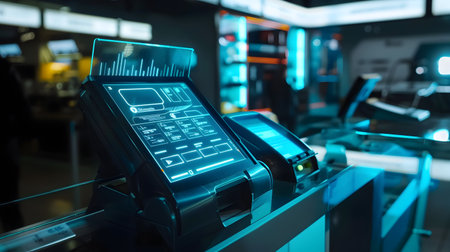 Futuristic digital payment terminal with holographic interface in a cyberpunk themed retail store Advanced touchscreen display sleek design