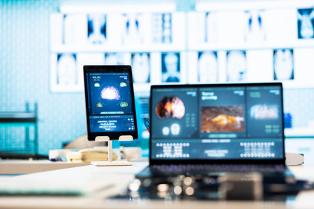 Empty doctor office equipped with modern medical equipment and pills, getting ready to consult patients. Highlighting advanced diagnostics, healthcare services and patient care management.