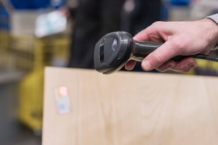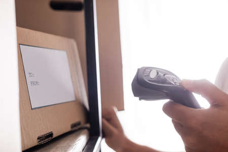 A man scanning a barcode, buying and selling concept. Scene. Close up of hand holding bar code scanner, scanning packages labels with laser on box.