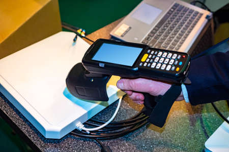 Data collection terminal. Data collection terminal in hand. Terminal is portable. Portable device for warehouse worker. Electronic equipment for a warehouse. Modern barcode reader.