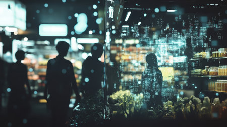 A floating market scene with animated silhouettes of consumers engaging with virtual products embodying the essence of modern purchasing habits