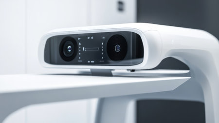 Closeup of a compact advanced camera integrated into a telemedicine station highlighting its multiple lenses and adjustable settings. The setup is designed for highquality video call