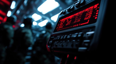 Shot from an angled perspective this closeup features a mounted secure radio unit prominently displaying a digital readout of frequency and encryption status. The background is fille
