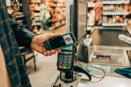 Customer buying food from cashier and paying at the till. Supermarket store. Man paying with contactless credit card in smartphone in grocery store