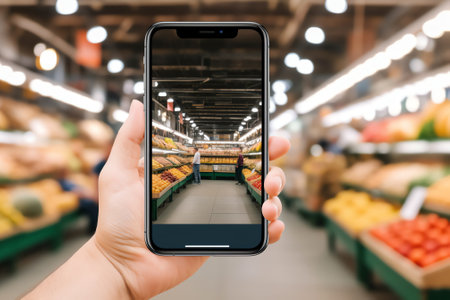 Woman shopping in a supermarket, using a smartphone to take a photo of a grocery store