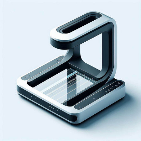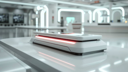 Futuristic Technology Setup in a Modern Exhibition Space Showcasing a Sleek Device With LED Lights and a Minimalist Design for Innovative Efficiency. Generative AI
